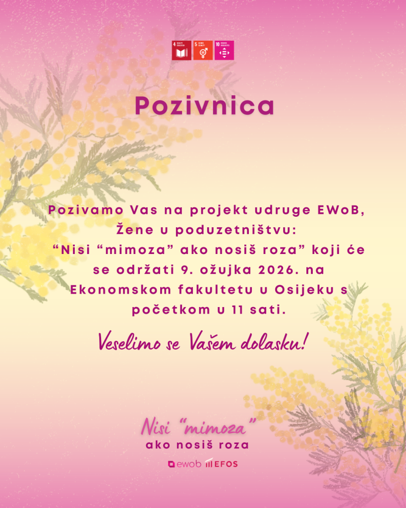 Ovogodišnje izdanje projekta održat će se 9. ožujka u prostoru Ekonomskog fakulteta u Osijeku (Aula glagoljice). Krovna tema projekta je „Nisi „mimoza” ako nosiš roza”, kojom želimo otvoriti razgovor o predrasudama i stereotipima s kojima se žene susreću u poslovnom i privatnom životu. Kroz predavanja, podcast i debatu nastojimo ohrabriti mlade žene da se uključe u poduzetničke vode, te doprinijeti stvaranju poticajnog i ravnopravnog okruženja.
