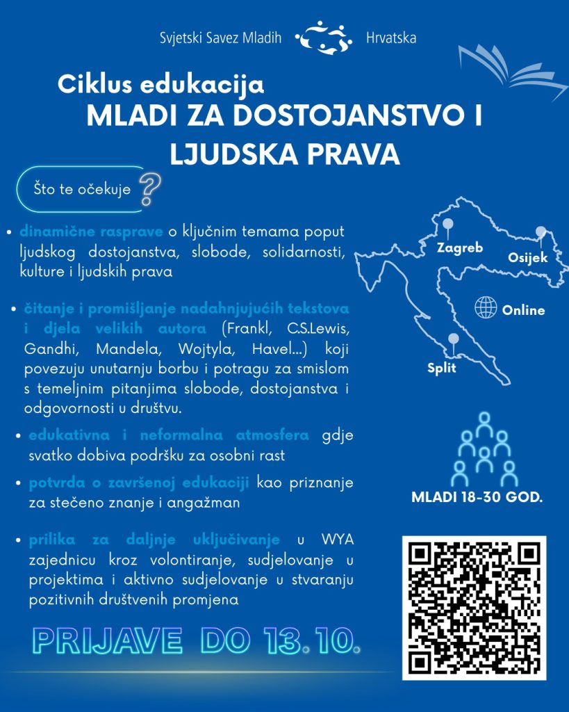 Svjetski savez mladih Hrvatska otvorio je prijave za edukaciju Mladi za dostojanstvo i ljudska prava. Edukacija je namijenjena mladima od 18 do 30 godina, besplatna je i održava se na hrvatskom jeziku. Edukacija se provodi u Zagrebu, Osijeku i Splitu, a sastoji se od sedam susreta tijekom kojih se sudionici upoznaju s temama kao što su ljudsko dostojanstvo, sloboda, solidarnost, kultura i ljudska prava. Na susretima se obrađuju tekstovi autora kao što su C.S. Lewis, Karol Wojtyla, Viktor Frankl, Charles Malik, Vaclav Havel i brojni drugi. Rasprave će voditi educirani mentori, a održavat će se u malim grupama te u ugodnoj i mladenačkoj atmosferi.