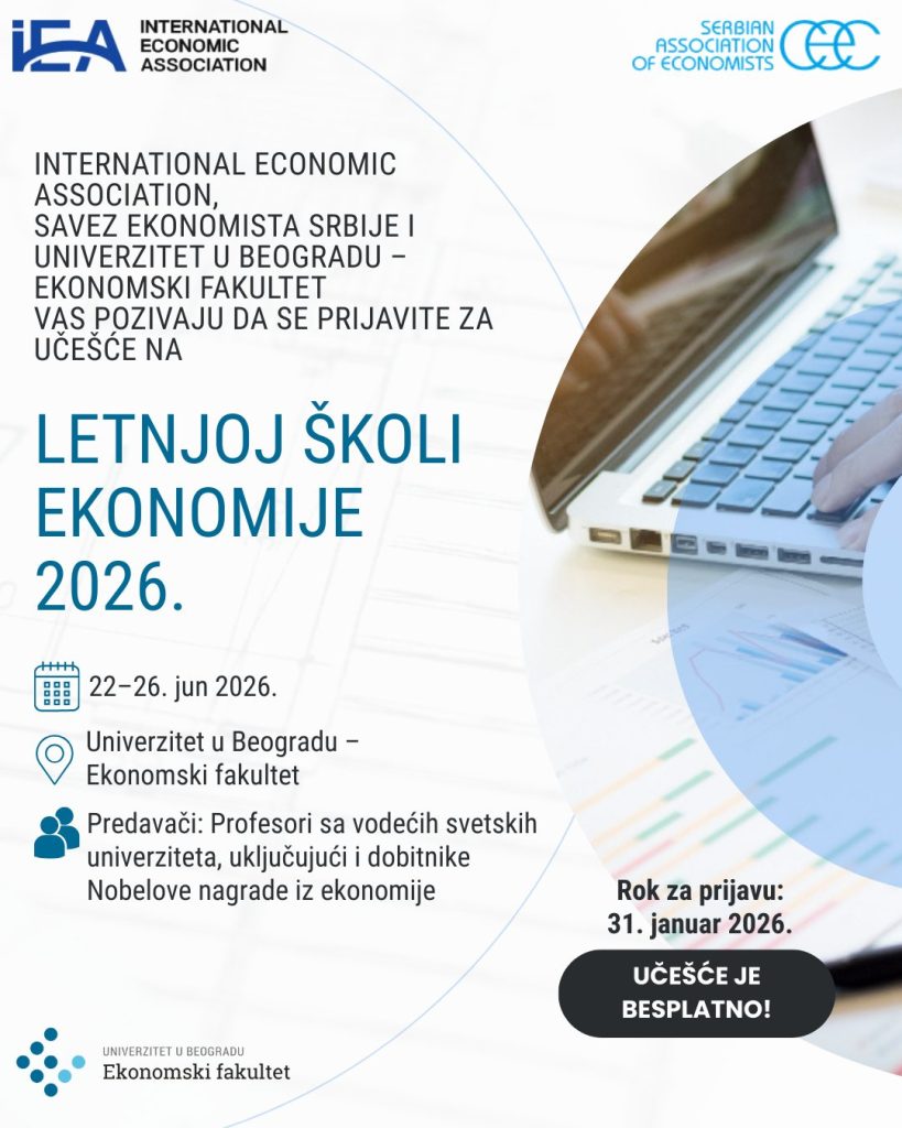Od 22. do 26. lipnja 2026. godine na Ekonomskom fakultetu Univerziteta u Beogradu održati će se letnja škola ekonomije, koju naš Ekonomski fakultet organizuje u saradnji sa International Economic Association i Savezom ekonomista Srbije.