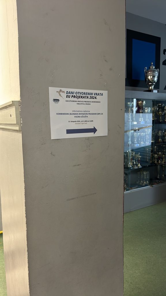 U sklopu Dana otvorenih vrata EU projekata u organizaciji Ministarstva regionalnog razvoja i fondova Europske unije, Ured za projekte i programe EU pri Ekonomskom fakultetu u Osijeku organizirao je informativnu radionicu pod naslovom: Kombinirani (blended) intenzivni programi (BIP) za visoka učilišta. Radionica se održala u utorak, 15.10.2024. na Ekonomskom fakultetu u Osijeku, a da je tema vrlo aktualna i zanimljiva govori i to da je dvorana bila puna - na radionicu je došlo 60-ak sudionika s velikog broja sastavnica Sveučilišta Josipa Jurja Strossmayera u Osijeku.