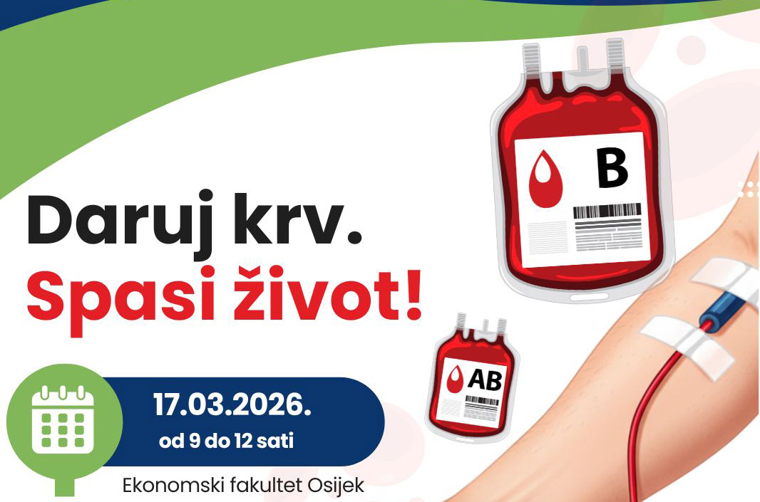Akcija darivanja krvi na EFOS-u održat će se u utorak, 17. ožujka 2026., od 9 do 12 sati u dvorani 13.​