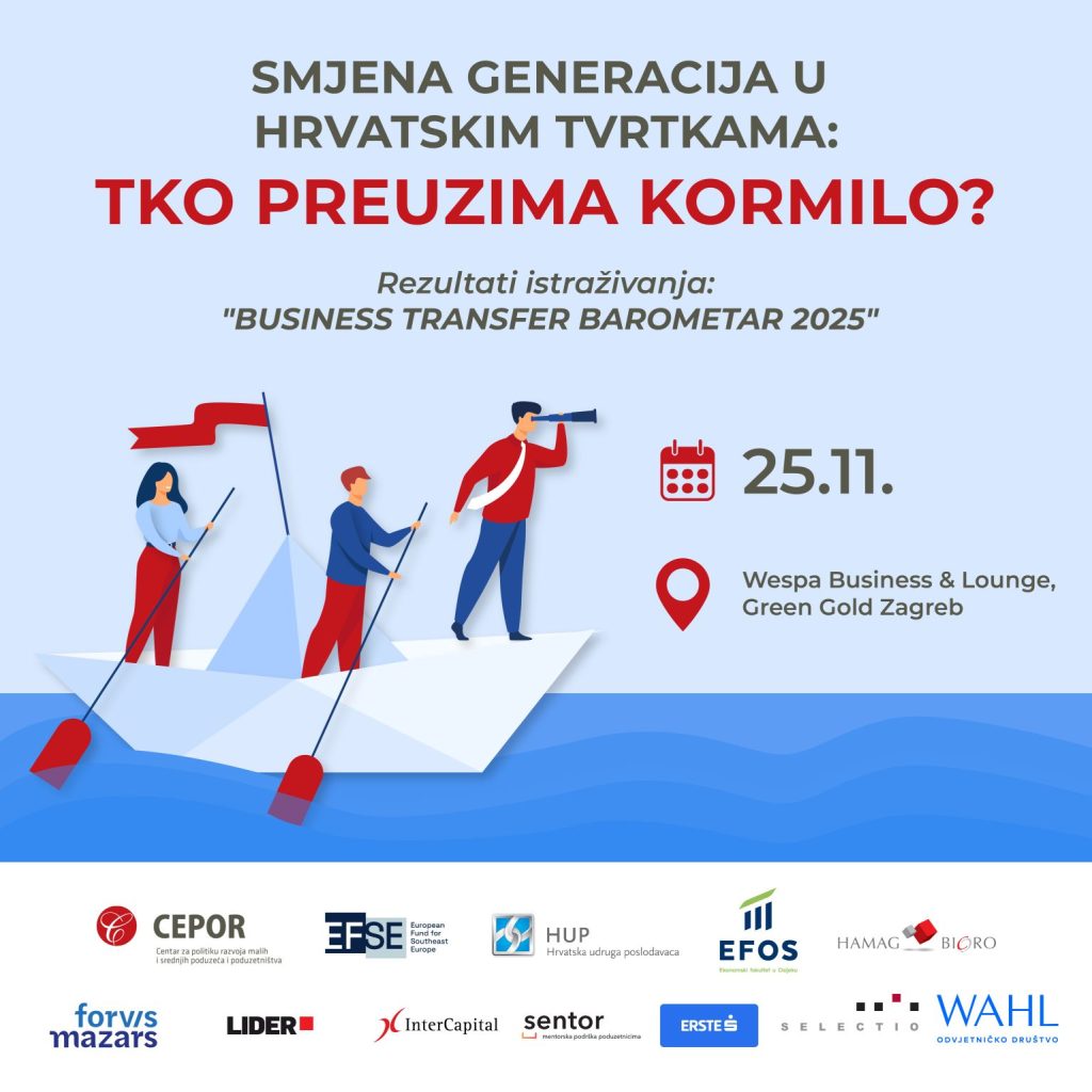 Hrvatska udruga poslodavaca i CEPOR, zajednički organiziraju konferenciju „Smjena generacija u hrvatskim tvrtkama – tko preuzima kormilo?“ i predstavljanje rezultata istraživanja Business Transfer Barometar 2025.