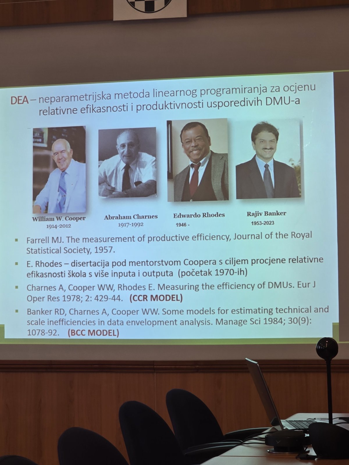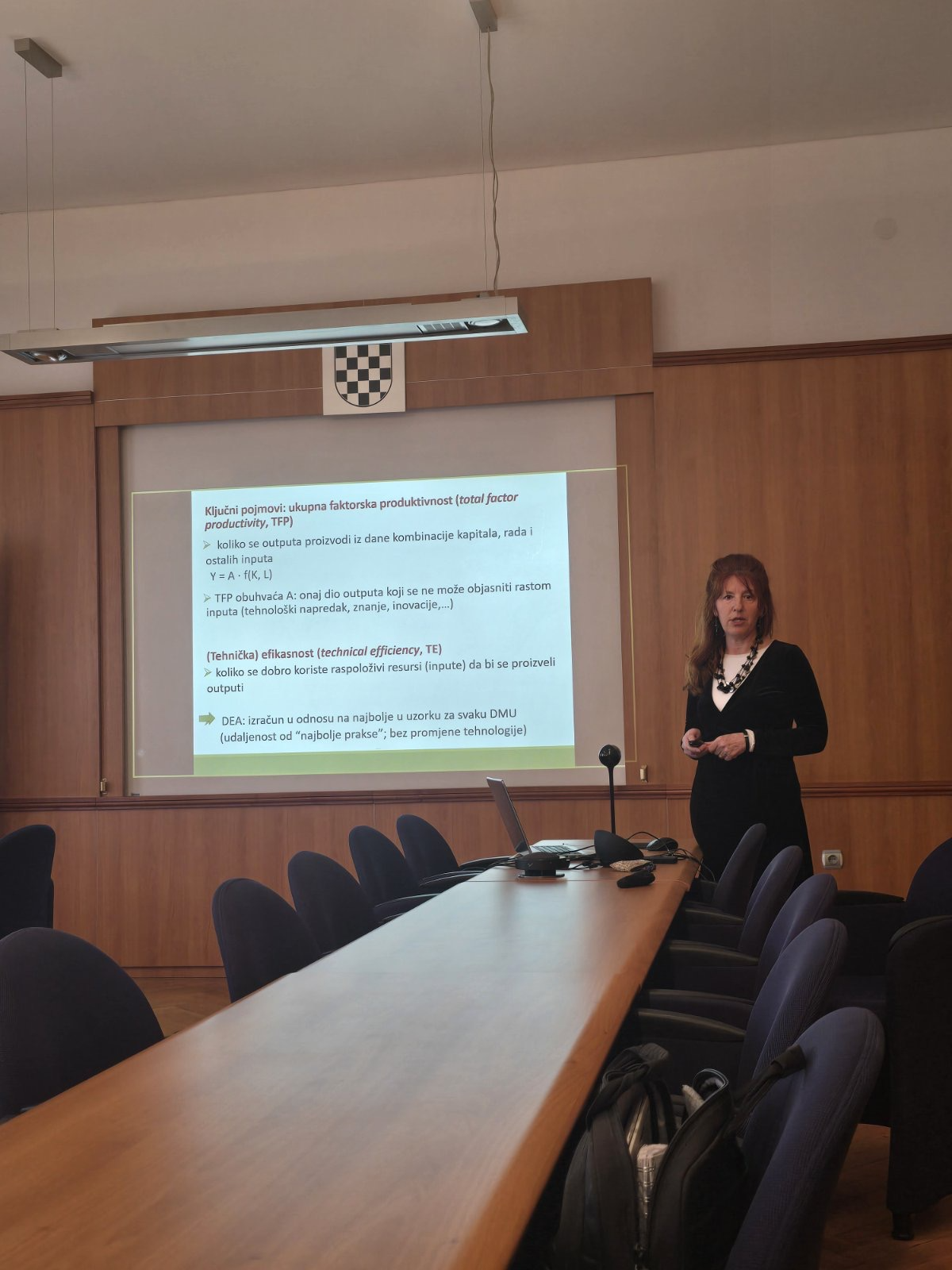 U okviru radionice sudionici su se upoznali s ključnim metodološkim konceptima relevantnima za provedbu projektnih istraživanja, uključujući metodu analize omeđivanja podataka (Data Envelopment Analysis, DEA) i Malmquist-Luenberger indeks produktivnosti kao alate za mjerenje zelene ukupne faktorske produktivnosti uz uvažavanje nepoželjnih outputa poput CO2 emisija. Praktični dio radionice obuhvatio je primjer izračuna tehničke efikasnosti u statističkom programu Stata.
