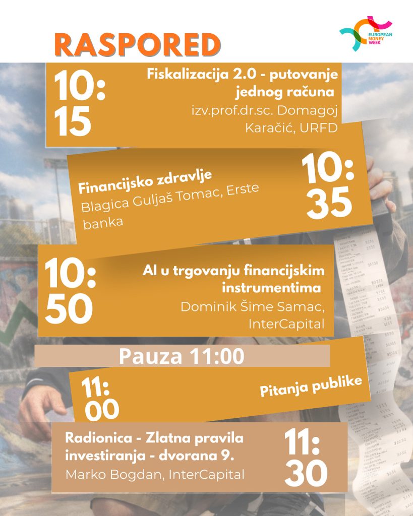 Europski tjedan novca 2026. još jednom potvrđuje važnost edukacije u području financija, ističući kako informirane i odgovorne odluke doprinose financijskoj sigurnosti pojedinca i stabilnosti društva u cjelini. Svako predavanje zamišljeno je tako da pronalazi svog slušatelja, jer teme koje obrađuju – od fiskalizacije 2.0. i AI-ja u financijama do investiranja i upravljanja rizikom – odražavaju aktualne razgovore i izazove o kojima se danas treba pričati.